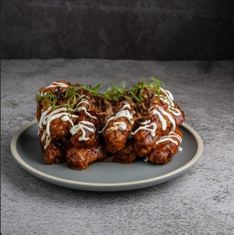 8 alitas glaseadas en OG Salsa Atlántico 12 años, con melaza de mar y un final de queso crema infusionado al humo.