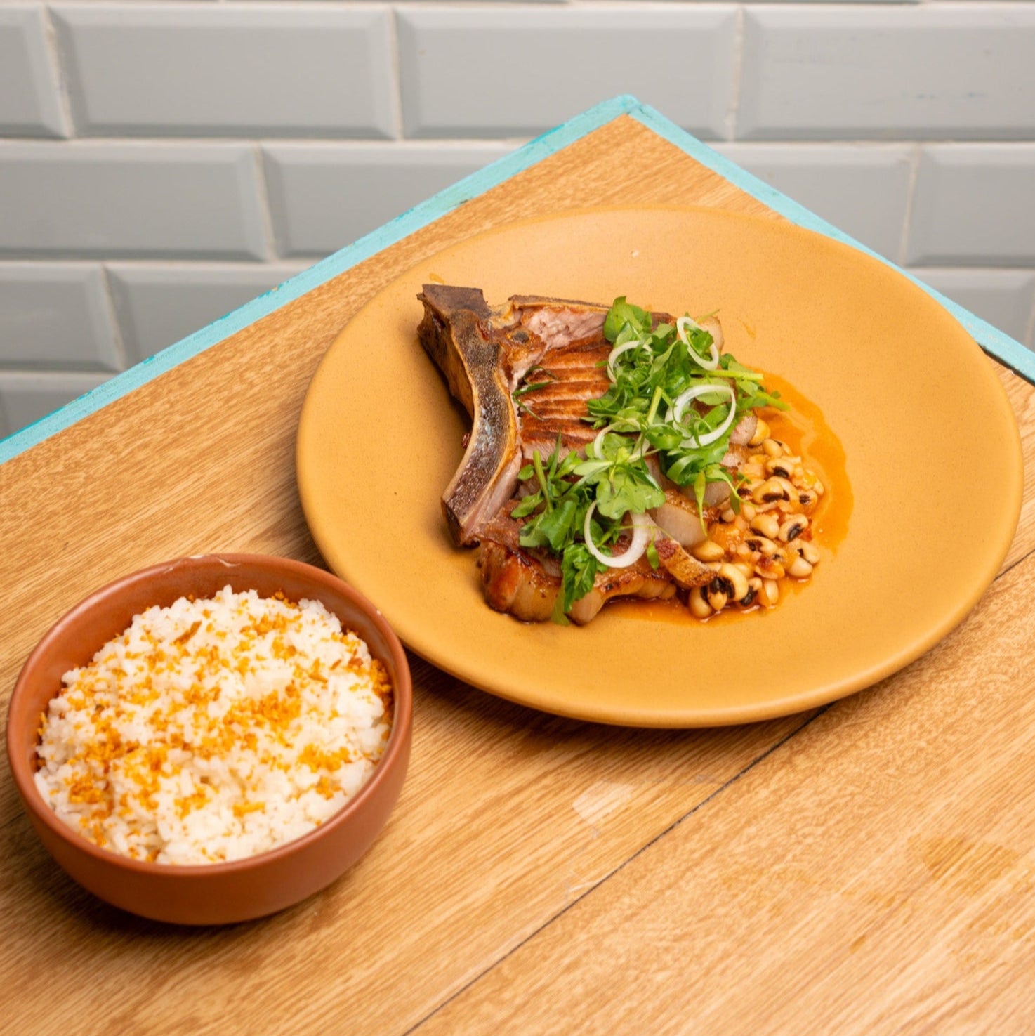 Chuletón de cerdo ahumado con frijoles dulces y arroz con coco con ajos tostados. Porción tamaño regular recomendado para 2 personas.