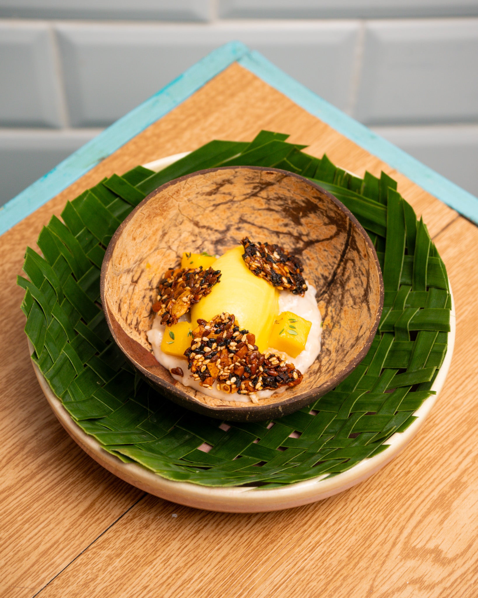 Arroz con leche cremoso, coronado con sorbeto de mango y trozos de mango fresco. Una galleta crujiente de semillas y una crema inglesa infusionada con tomillo.